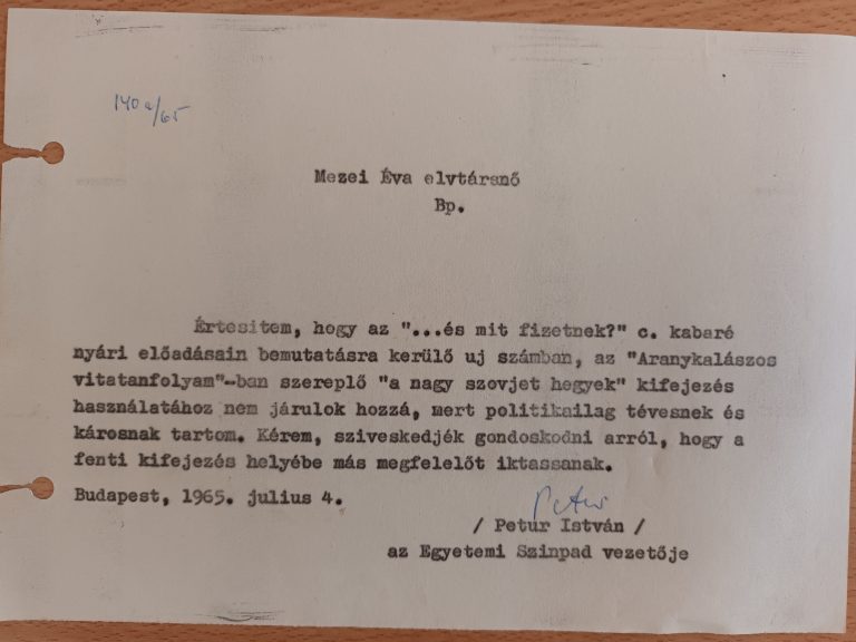 Keresés címkék alapján Jelölje ki a címké(ke)t! Keress 'AND' 'OR' uncheck all Cenzúra utasítás Petur István mint az Egyetemi Színpad vezetője egy mondat cenzúrázását kéri Mezei Évától.